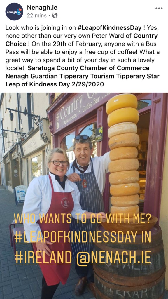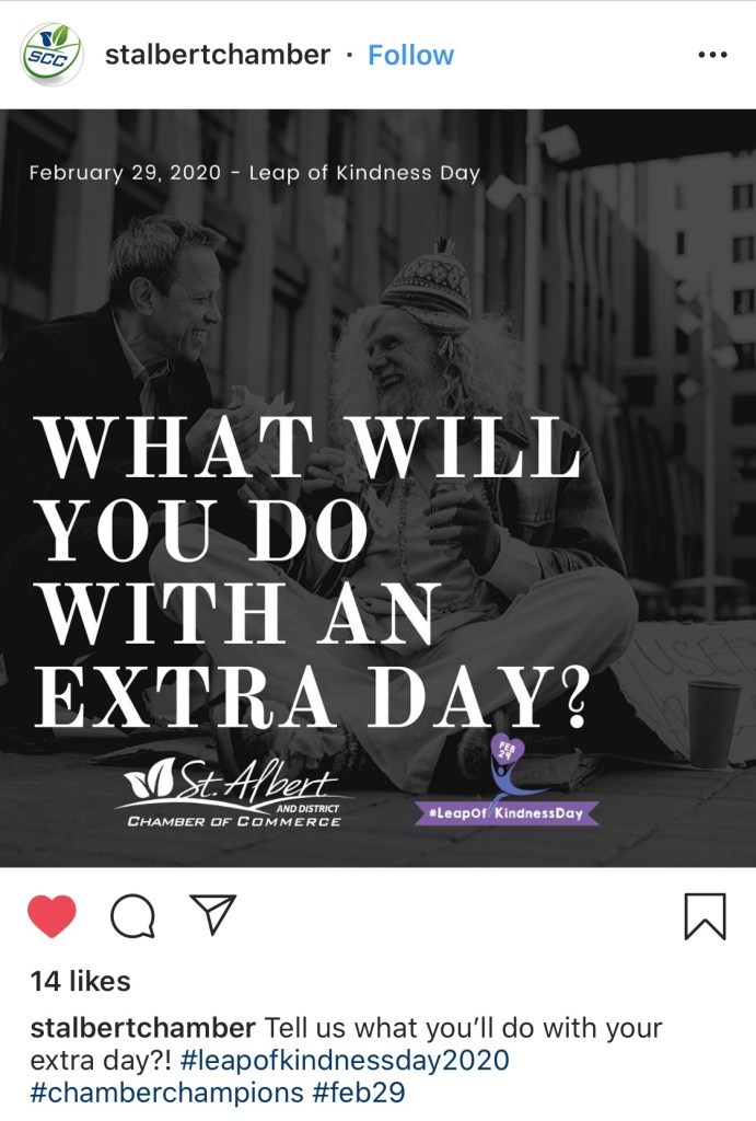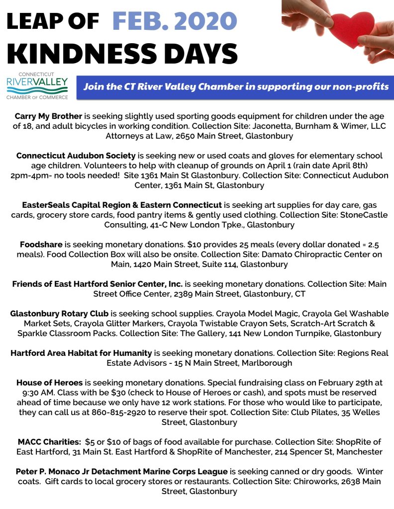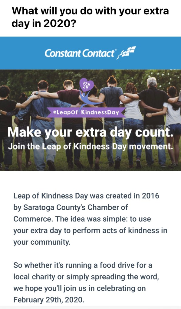 Leap of Kindness Day was invented by the Saratoga County Chamber of Commerce in 2016, and dozens of area employers and hundreds of their employees donated time, talent, and treasure to support local nonprofits, seniors, first responders, health care workers, Veterans, animal shelters, etc. In 2020, more than 200 communities in the US, Canada, and Ireland participated in Leap of Kindness Day, and more than 250 communities from Singapore, to New Zealand, to the UK, Canada and across the United States joined this movement in 2024.