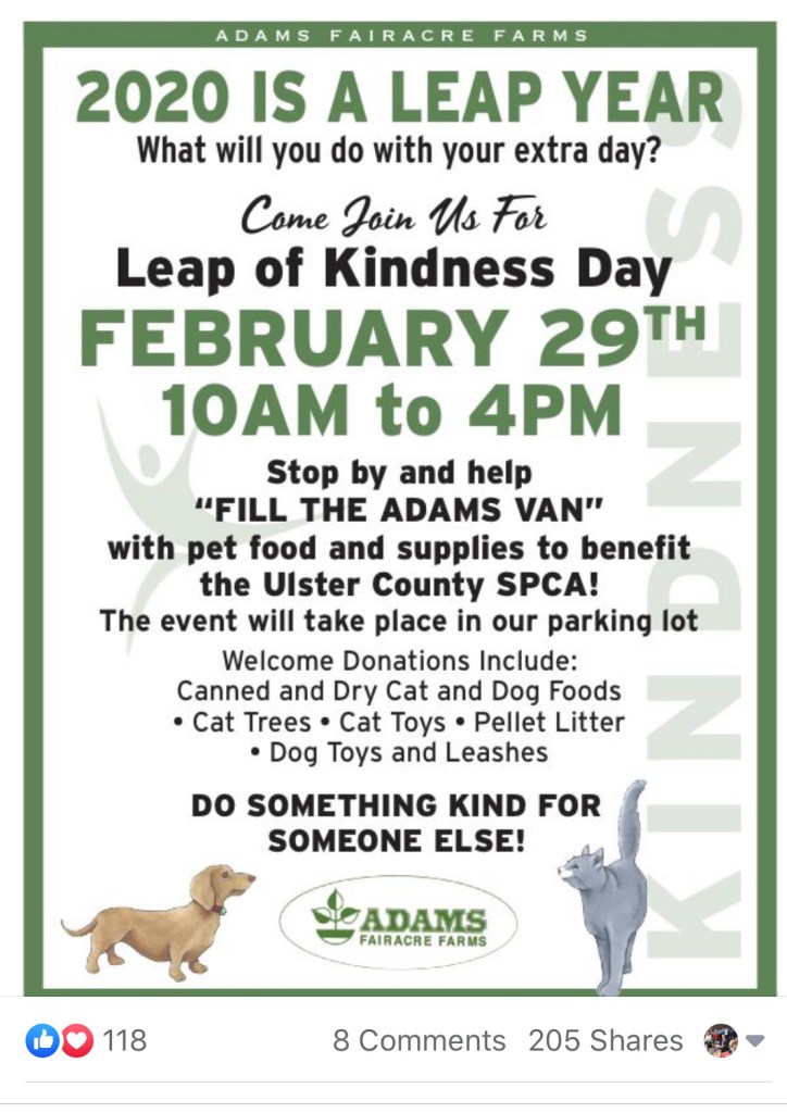 Everyone that participates in Leap of Kindness Day is encourage to share what you are doing or what your organization needs via social media. When posting, please use the hashtag #leapofkindnessday so that we can track the acts of kindness taking place all over the world. You can also tag the Saratoga County Chamber of Commerce and we will share your posts on this website and via our social media. Below are a few of the posts we have already shared as we try to encourage our community to help local nonprofits in Saratoga County, New York.