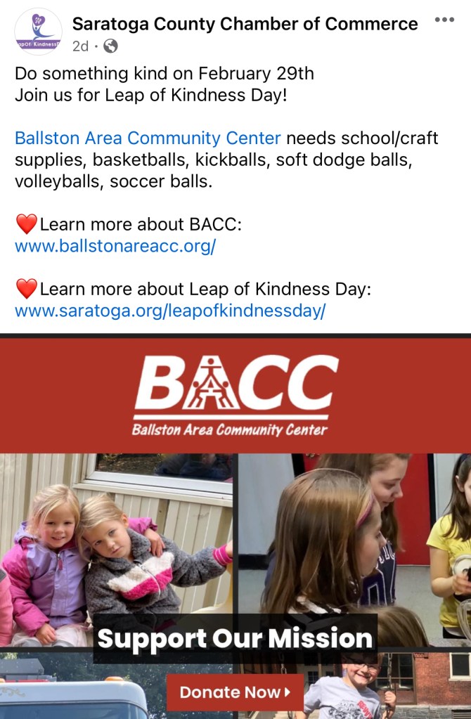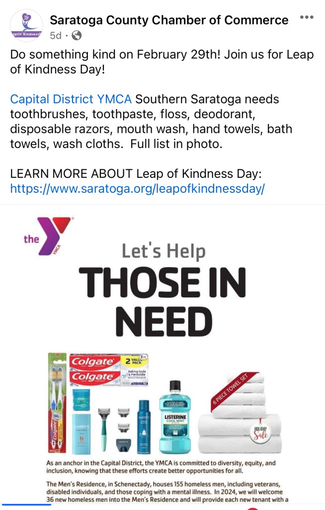 Everyone that participates in Leap of Kindness Day is encourage to share what you are doing or what your organization needs via social media. When posting, please use the hashtag #leapofkindnessday so that we can track the acts of kindness taking place all over the world. You can also tag the Saratoga County Chamber of Commerce and we will share your posts on this website and via our social media. Below are a few of the posts we have already shared as we try to encourage our community to help local nonprofits in Saratoga County, New York.